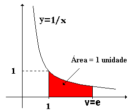 Se tomarmos um ponto v do eixo OX, com v>1 tal que a área da região do primeiro quadrante localizada sob a curva y=1/x e entre as retas x=1 e x=v seja unitária, então o valor de v será igual a e.