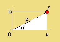 No gráfico anterior podemos observar que existe um triângulo retângulo cuja hipotenusa correspondente à distância entre a origem 0 e o número complexo z, normalmente denotada pela letra grega ro, o cateto horizontal tem comprimento igual à parte real a do número complexo e o cateto vertical corresponde à parte imaginária b do número complexo z.