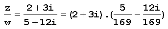 Exemplo: Para dividir o número complexo z=2+3i por w=5+12i, basta multiplicar o numerador e também o denominador da fração z/w pelo conjugalo de w: