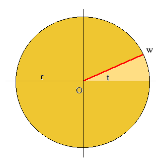 O primeiro passo é realizar um desenho mostrando es|e número complexo w em um círculo de raio r e observar o argumento t, dado pelo angulo entre o eixo OX e o número complexo w.