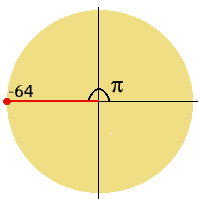 Exemplo: Para obter a primeira raiz da equação x8=-64, observamos a posição do número complexo w = -64 + 0 i, constatando que o seu módulo é igual a 64 e o argumento é um ângulo raso (pi radianos = 180 graus).